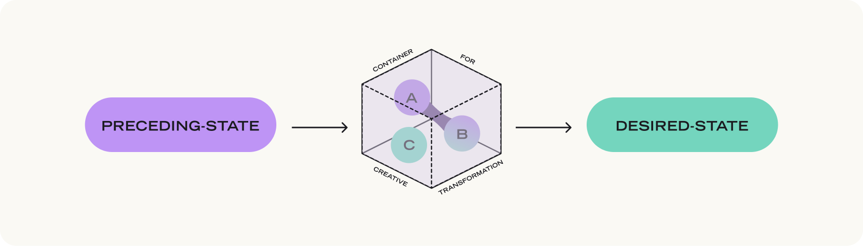I termed the intermediate phase (bridge-state) of the formula a container for creative transformation. Within this container, a combination of conditions catalyzed the shift from preceding-state → desired-state.