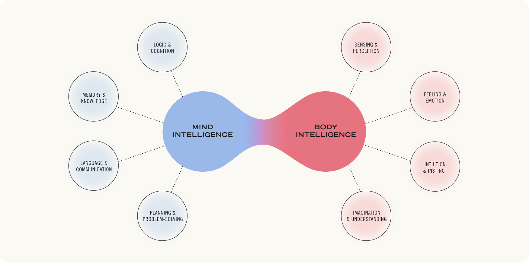 Body-intelligence, on the other hand, is where intuition and understanding reside. It’s a subtler, more fluid intelligence that senses, feels, and emotes — processing information in a way that’s often beyond words. This intelligence perceives significance through gut feelings, emotional responses, and embodied awareness. It’s where creative impulses originate.
