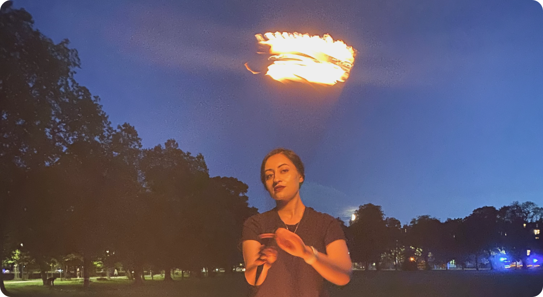 Following a brief (too brief, if you asked my nerves) safety demonstration, Iga handed us the sticks we’d be using, which were soon lit on both ends. We followed her movements as she guided us through the steps, spinning amid flames. My apprehension quickly faded as our cautious steps nimbly turned into a mesmerizing rhythm. Flowing with the fire, it was impossible to be aware of anything other than the present moment. That’s how we spent the next hour, immersed in the radiant bloom, reigniting each other’s flames whenever one went out.